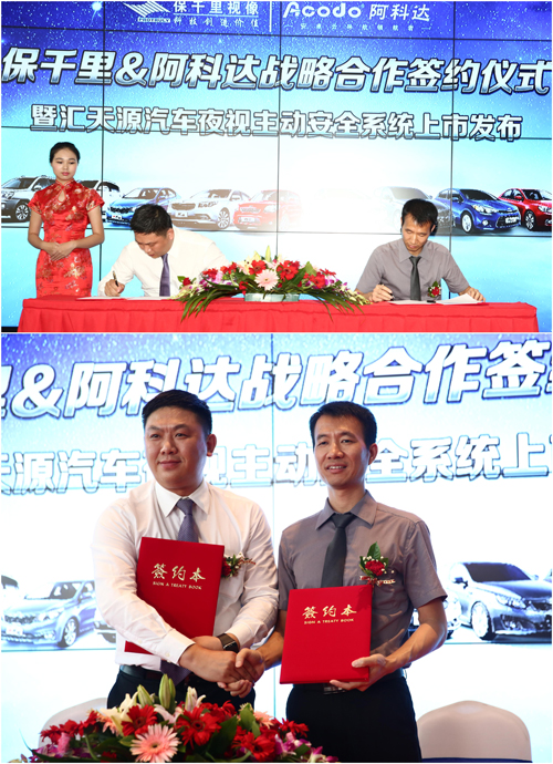保千里&阿科达战略合作签约仪式暨汇天源汽车夜视主动安全系统上市发布会于8月19日在深圳市东风悦达起亚香蜜湖4S店举行。